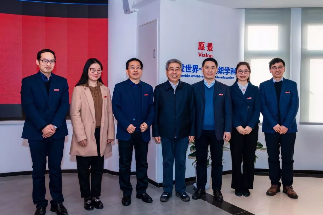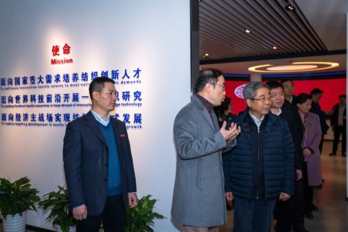 陈宝生部长一行在校党委书记刘承功,校长、校党委副书记俞建勇等陪同下来到我院纺织科学与工程一流学科展示厅,调研纺织科学与工程一流学科建设成就和当前进展。