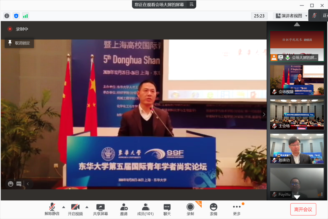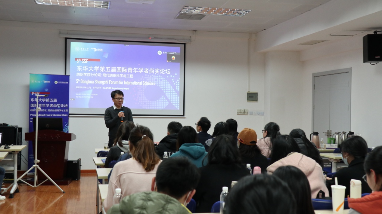 12月26日下午5:00,东华大学第五届国际青年学者尚实论坛“现代纺织科学与工程”分论坛在澳门线上赌场 楼3004会议室举行,本次分论坛分为线上线下同步举行。澳门线上赌场 党委书记李成龙,副院长王富军,副院长许福军,各系系主任及学生共计100余人参加了本次分论坛。